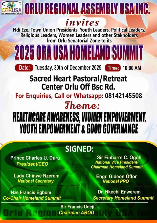 Orlu Regional Assembly, USA (ORA USA) is a non-profit organization and is tax-exempt under section 501(c)(3) of the Internal Revenue Code.